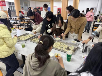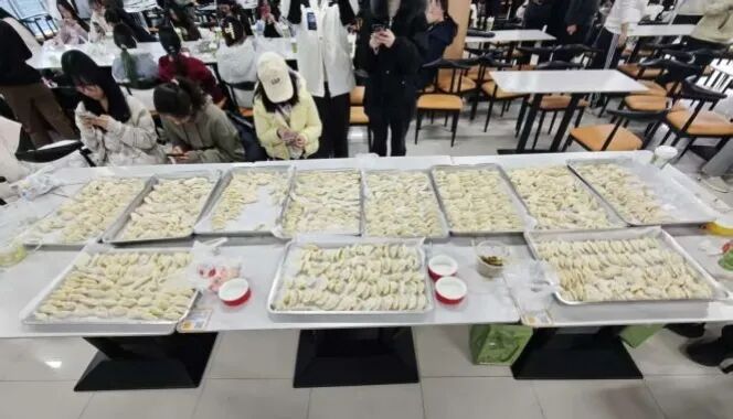 活动在同学们的欢声笑语中开始,擀一张薄皮,裹几分烟火,与同窗共赴一场暖冬的饺香之约。从挑选饺子皮、放置喜欢的馅料到精心捏合,每一步大家都在用心完成,指尖揉捻的是面团,心头攒聚的是温情,这个冬日,以饺会友,暖意丛生。手法娴熟的“老手”们飞快地包出一个个圆润饱满的饺子,形态各异的元宝饺、月牙饺在他们手中成型;而初次尝试的“新手”们也不甘示弱,他们包出来的饺子虽略显“奇形怪状”,却也充满了独特的趣味。