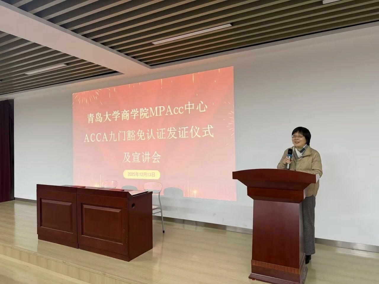 2025年12月13日(周六)下午1点,青岛大学商学院MPAcc中心ACCA九门豁免认证发证仪式及宣讲会在图文中心3楼报告厅顺利举行。