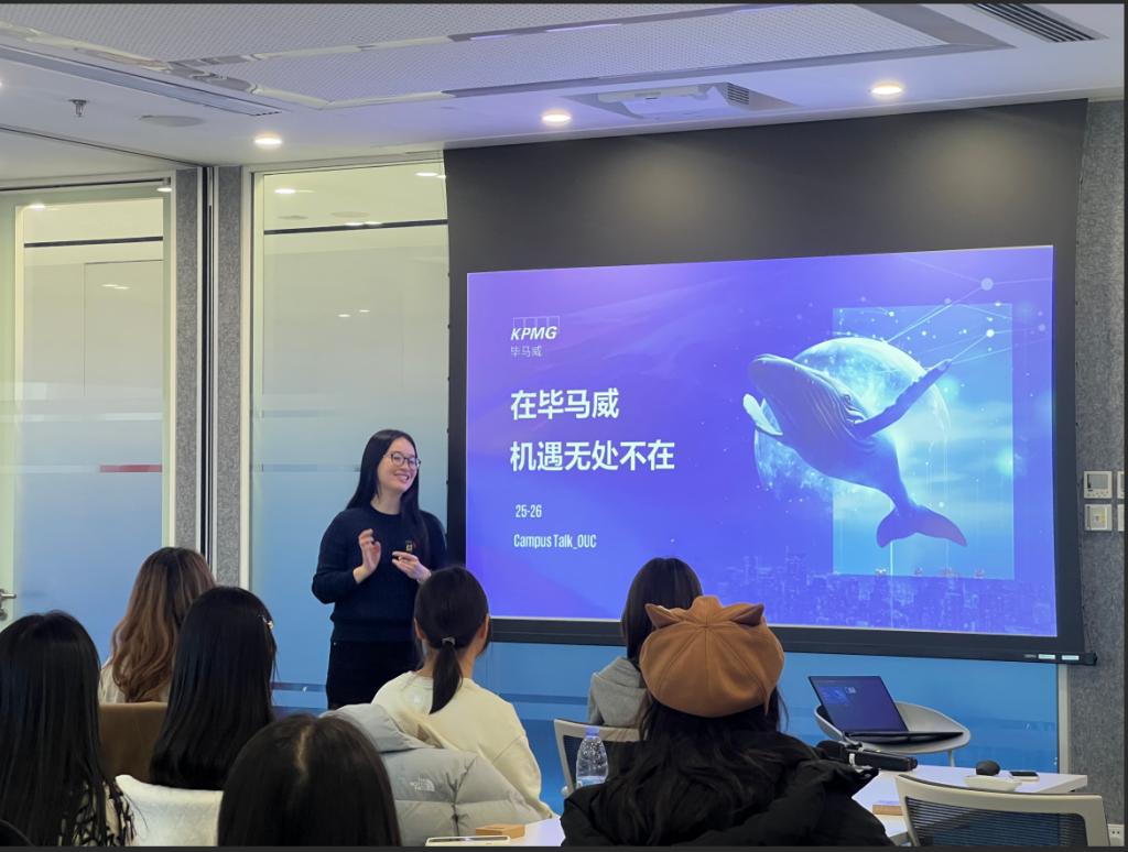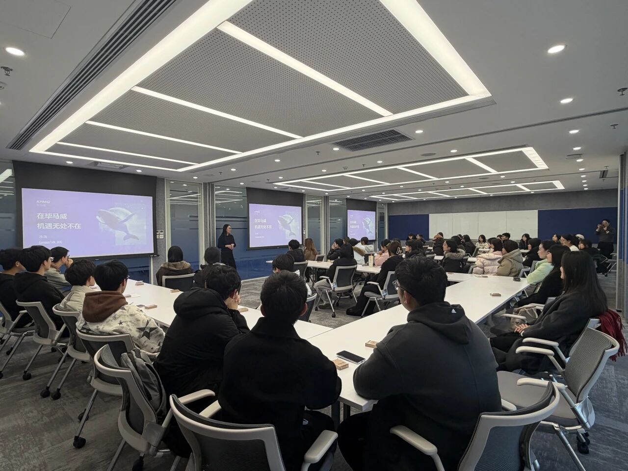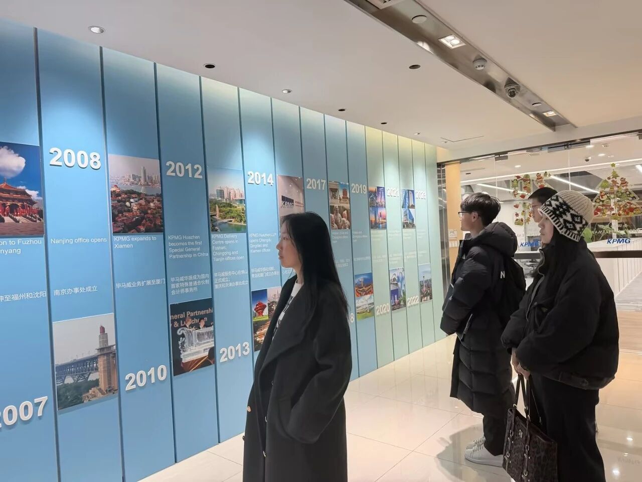 随后,同学们走进毕马威办公区域。内容详实的发展墙系统梳理了企业大事记与核心成就,让大家对其品牌与成长脉络有了更深入的了解;开放通透、遥望大海的办公环境,让同学们对职场场景有了直观且正面的感受。