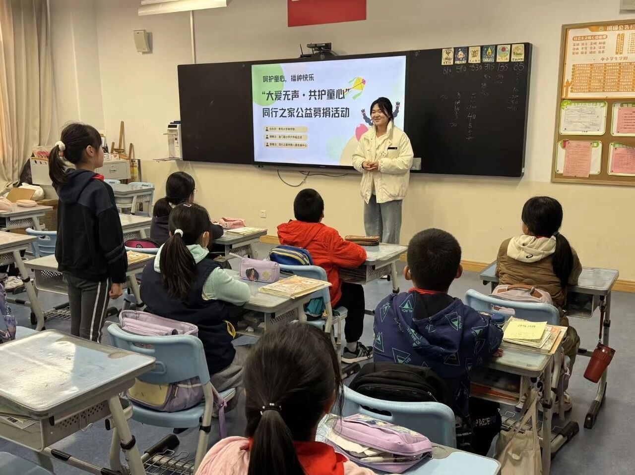 活动前期,志愿者们首先启动物资募集工作,通过多渠道汇聚爱心:在青岛大学金家岭校区剑湖旁设置宣传点,向全校同学发出暖心倡议;同时面向学院教职工、金门路小学六年级五班学生征集物资,最终募集到书籍、文具、益智玩具等丰富多样的儿童用品,为后续实地探访奠定了坚实的物质基础。