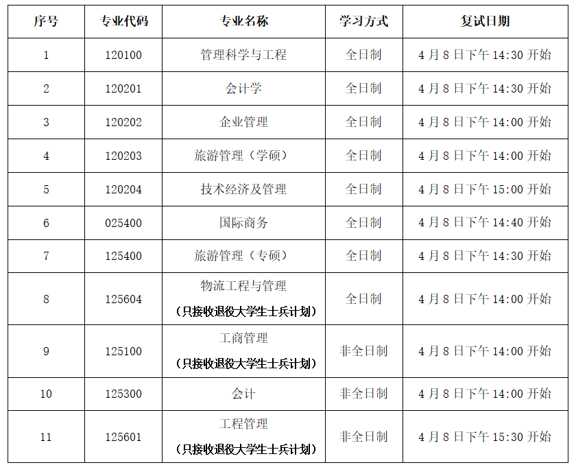 1.我校调剂通过中国研究生招生信息网(http://yz.chsi.com.cn/)“全国硕士生招生调剂服务系统”进行,接收调剂网上报名为4月8日0:00-12:00,请考生登陆调剂服务系统,按要求填报调剂志愿。我院拟于4月8日14:00启动调剂复试,复试安排如下表所示(具体复试时间,请于复试当天进入中国研究生招生信息网查看):